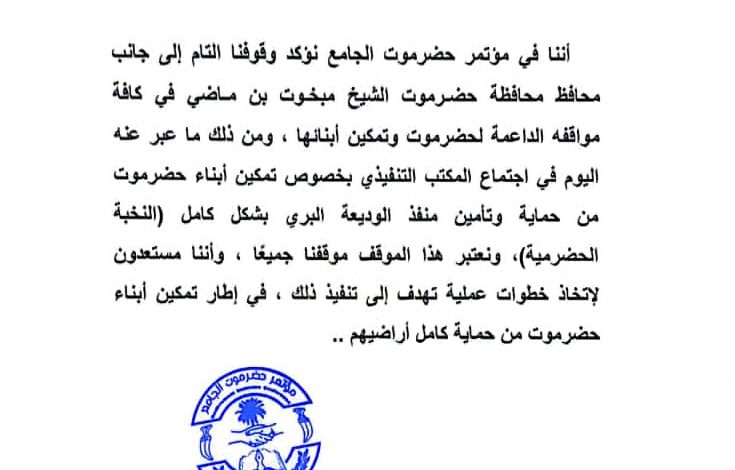 «أننا في مؤتمر حضرموت الجامع نؤكد وقوفنا التام إلى جانب محافظ محافظة حضـرموت الشيخ مبخـوت بن مـاضي في كافة مواقفه الداعمة لحضرموت وتمكين أبنائها , ومن ذلك ما عبر عنه اليوم في اجتماع المكتب التنفيذي بخصوص تمكين أبناء حضرموت من حماية وتأمين منفذ الوديعة البري بشكل كامل (النخبة الحضرمية), ونعتبر هذا الموقف موقفنا جميعًا , وأننا مستعدون لإتخاذ خطوات عملية تهدف إلى تنفيذ ذلك , في إطار تمكين أبناء حضرموت من حماية كامل أراضيهم» ..