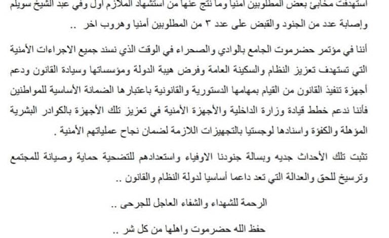 أننا في مؤتمر حضرموت الجامع بالوادي والصحراء في الوقت الذي نسند جميع الإجراءات الامنية التي تستهدف تعزيز النظام والسكينة العامة وفرض هيبة الدولة ومؤسساتها وسيادة القانون ودعم أجهزة تنفيذ القانون من القيام بمهامها الدستورية والقانونية باعتبارها الضمانة الاساسية للمواطنين، فأننا ندعم خطط قيادة وزارة الداخلية والأجهزة الامنية في تعزيز تلك الأجهزة بالكوادر البشرية المؤهلة والكفؤة واسنادها لوجستيا بالتجهيزات اللازمة لضمان نجاح عملياتهم الامنية .