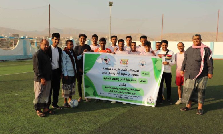 دشن المجلس الطلابي بكلية الأدآب والعلوم الإنسانيه بجامعة حضرموت دوري كره القدم برعاية كريمة من قبل مدير مكتب الشباب والرياضة بمحافظة حضرموت لحكومه شباب واطفال اليمن وإشراف عمادة كلية الآداب والعلوم الإنسانية، بحضور عميد الكلية أ.د محمد عوض بارشيد، وعبر العميد بارشيدعن اعتزازهم بوجود مثل هذه الانشطه الطلابية لما لها من دور في صقل مهارات الطلاب وإبرازها وتفعيل دور الأنشطة للكلية