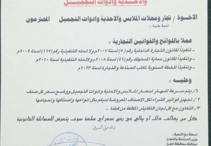 ودعا مكتب الصناعة والتجارة كافة المحلات التجارية إلى سرعة اشهار أسعار الملابس والأحذية وأدوات التجميل ووضع سعر على كل صنف، مع تجهيز فواتير الشراء لكل الأصناف المعروض لكل الأصناف المعروضة وانواعها وأحجامها.