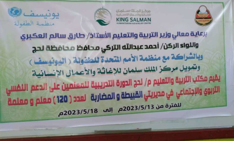 برعاية كريمة من معالي وزير التربية والتعليم الدكتور طارق العكبري ومحافظ محافظة لحج اللواء الركن / احمد عبدالله تركي والاستاذ / فهمي بجاش ثابت هواش مدير مكتب التربية والتعليم بالمحافظة ، دُشِّنَ صباح اليوم في مديريتي كرش والمضاربه رأس العاره الدورة التدريبية لبرنامج الدعم النفسي التربوية الاجتماعي بتمويل من مركز الملك سلمان للاغاثة والاعمال الانسانية وتنفيذ منظمة اليونيسف واشراف مكتب التربية والتعليم بالمحافظة بمشاركة 60 معلما ومعلمة من كل مديرية.