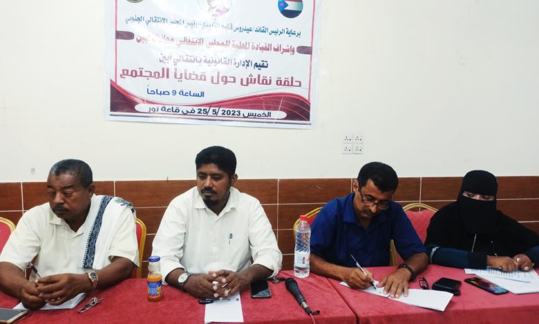 قانونية انتقالي أبين تنظم حلقة نقاشية حول قضايا المجتمع