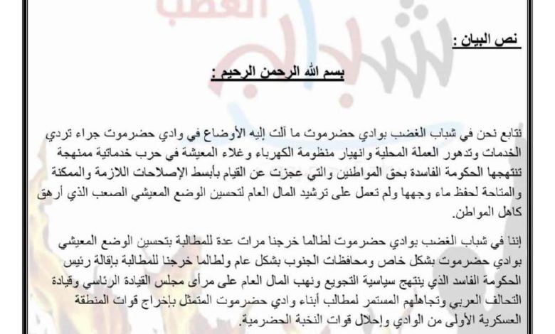 نص البيان : نتابع نحن في شباب الغضب بوادي حضرموت ما آلت إليه الأوضاع في وادي حضرموت جراء تردي الخدمات وتدهور العملة المحلية وانهيار منظومة الكهرباء وغلاء المعيشة في حرب خدماتية ممنهجة تنتهجها الحكومة الفاسدة بحق المواطنين والتي عجزت عن القيام بأبسط الإصلاحات اللازمة و الممكنة والمتاحة لحفظ ماء وجهها ولم تعمل على ترشيد المال العام لتحسين الوضع المعيشي الصعب الذي أرهق كاهل المواطن.