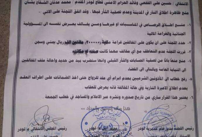 3-منع منعاً باتاً تصفية الثارات القبيلة داخل المدينة وإنها ستضرب بيد من حديد وإحالة من يخالف ذلك الى النيابة العامة والقضاء