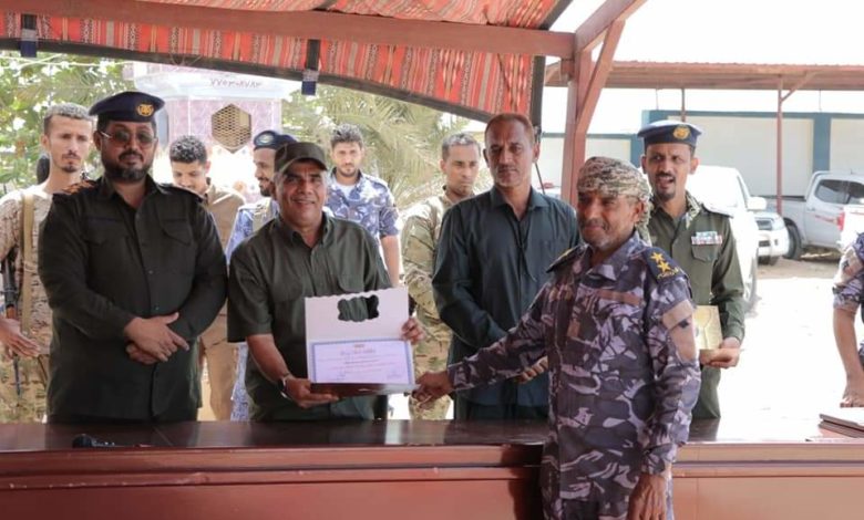 وكرّم مدير عام الأمن والشرطة العميد مطيع سعيد المنهالي، ومدير عام المديرية الأستاذ عبدالباسط باحميد، ومدير عام مكافحة المخدرات بوزارة الداخلية العميد عبدالله لحمدي، ومدير أمن المديرية العقيد هاني التميمي، في ختام الحفل الخطابي والتكريمي، الضباط والأفراد المبرزين في العمل الأمني والشخصيات الداعمة للأمن بدروع تذكارية وشهادات تقديرية نظير ما بذلوه من جهد لاستتباب الحالة الأمنية .