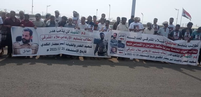 واكد والد الشهيد محضار محمد الكلدي انه في يومنا هذا تم تنفيذ الوقفة الاحتجاجيه للمره الثالثه على التوالي وها نحن نطرق باب القانون من اجل تسليم القاتل الذي اغتال ولدنا الشهيد امير المحضار، مطالبا ان يتم تسليم علاء المشرقي للنيابة العامة لاستكمال الاجراءات وتحويل القضية (لدار القضاء) للنظر فيها… موكدا نحن نطالب الجهات المسؤوله عدم المماطله حتى لا يحدث ما لا نرجو عقباه وتتخذ القضية مسار اخر، و اشار الى الان ونحن ملتزمين بتنفيذ القانون وتحويل القضية للمحكمة.