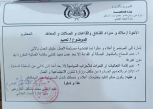 وأكد مدير إدارة البحث الجنائي، هاني محمد باشكيل الخزرجي، في بيان “عدم السماح باستئجار الصالة أو القاعة إلا بعد عمل تعهد كتابي بإقامة الفعالية المقررة لها دون غيرها”.