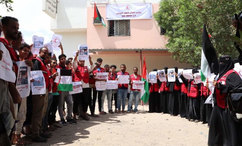 الهلال الأحمر اليمني بلحج ينظم وقفة احتجاجية تضامنا مع الهلال الأحمر الفلسطيني