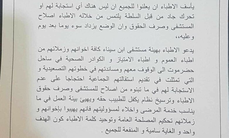 يدعو الأطباء بهيئة مستشفى ابن سيناء كافة اخوانهم وزملائهم من أطباء العموم وأطباء الامتياز والكوادر الصحية في ساحل حضرموت الى الوقوف معهم ومساندتهم في خطواتهم التصعيدية والتي تمثلت في تقديم استقالتهم الجماعية إحتجاجا على عدم الاستجابة لهم في ماتبنوه من اصلاح للمستشفى وصرف حقوق الأطباء وترسيخ نظام يكفل للطبيب حقه ويهيئ بيئة العمل في مايناسب خدمة المرضى واخلاء لمسؤوليتهم فانهم يهيبوا باخوانهم وزملائهم تحكيم المصلحة العامة وتوحيد كلمة الأطباء كون الهدف واحد والغاية سامية والمنفعة للجميع.
