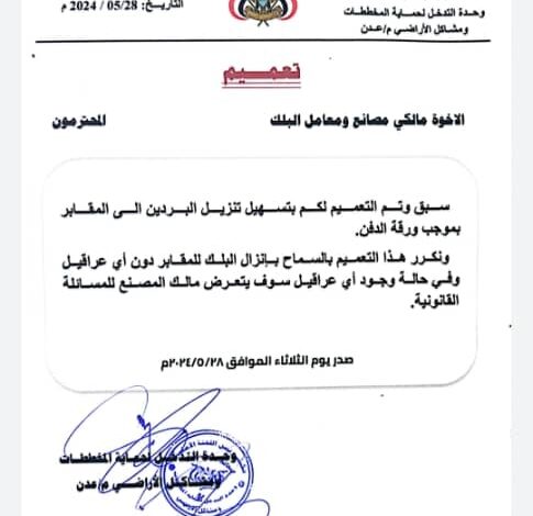 أصدرت وحدة حماية الأراضي بالعاصمة عدن تعميما على مصانع البردين بتسهيل تنزيل البردين للمقابر وعدم عرقلة ذلك تحت اي حجة او مبرر متعلق بوحدة حماية الاراضي.
