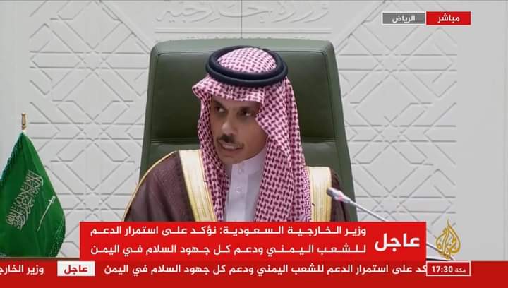 وقال وزير الخارجية السعودية فيصل بن فرحان، في مؤتمر صحفي إن بلاده تعلن مبادرة لها لإنهاء الحرب في اليمن، تشمل وقف إطلاق النار تحت إشراف الأمم المتحدة.