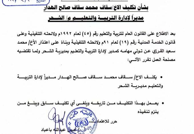 تكليف مديراً لإدارة التربية والتعليم بمديرية الشحر