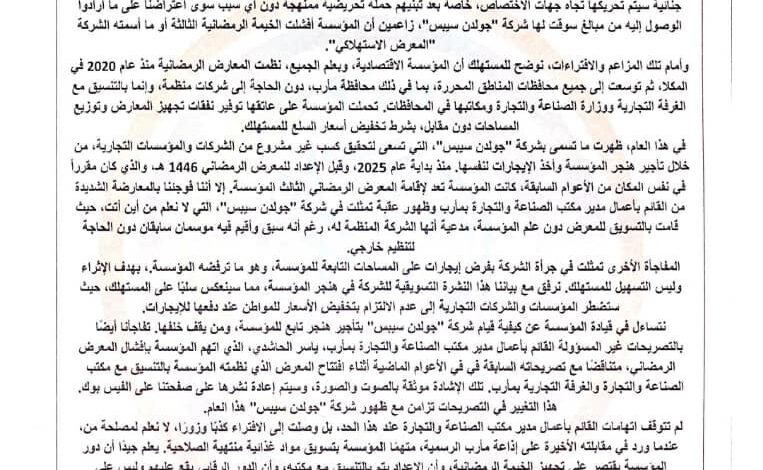 وأشارت المؤسسة إلى أنها فوجئت بظهور شركة “جولدن سيبس” هذا العام، التي قامت بالتسويق للمعرض دون علم المؤسسة، مدعية أنها الشركة المنظمة له، رغم أنه سبق وأقيم فيه موسمان سابقان دون الحاجة لتنظيم خارجي.