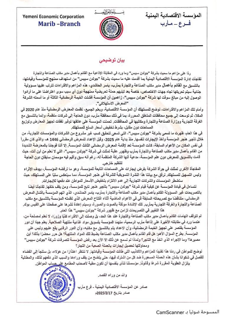 المؤسسة الاقتصادية ترد على مزاعم شركة “جولدن سيبس” وتؤكد التزامها باقامة المعرض الرمضاني في مأرب