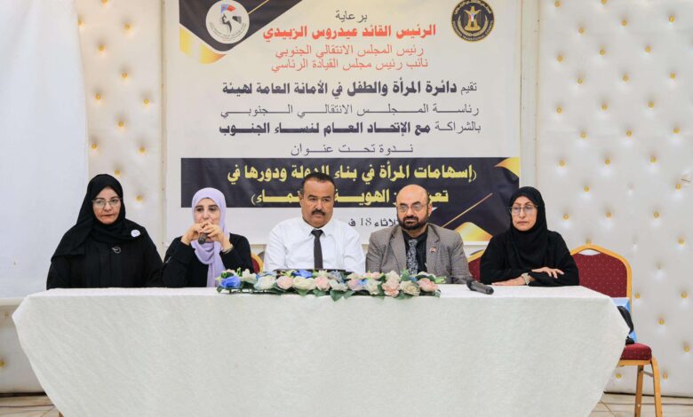 نظّمت دائرة المرأة والطفل في الأمانة العامة، اليوم الثلاثاء بالعاصمة عدن، ندوة بعنوان “إسهامات المرأة في بناء الدولة ودورها في تعزيز الهوية”، برعاية الرئيس القائد عيدروس الزبيدي رئيس المجلس الانتقال، وبحضور عدد من الشخصيات الأكاديمية والمهتمين بقضايا المرأة والتنمية.