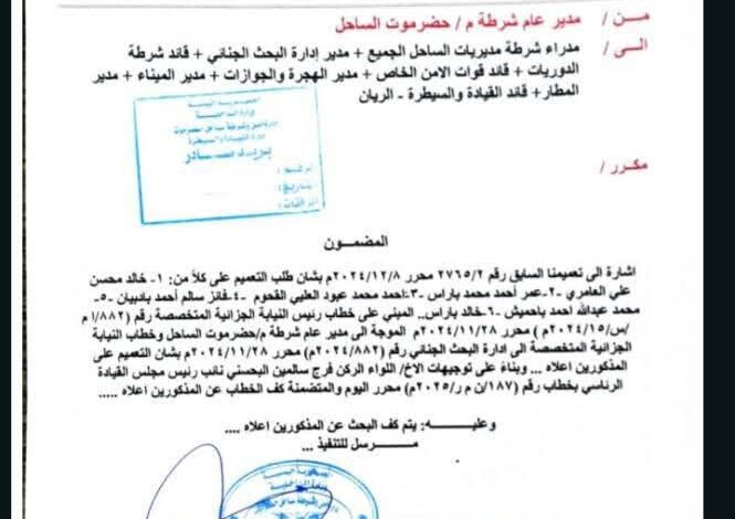 بناء على توجيهات الأخ / اللواء الركن فرج سالمين البحسني نائب رئيس مجلس القيادة الرئاسي بخطاب رقم (١٨٧/ ن م ر /٢٠٢٥م)، اصدر المدير العام لشرطة حضرموت الساحل اليوم، الخميس، تعميمًا بكف الخطاب عن 6 من رجالات حلف قبائل حضرموت ، وهم : 1- الشيخ خالد محسن العامري 2- عمر أحمد محمد باراس 3- أحمد محمد عبود العليي القحوم 4- فائز سالم أحمد بادبيان 5- محمد عبدالله أحمد باحميش 6- خالد باراس.