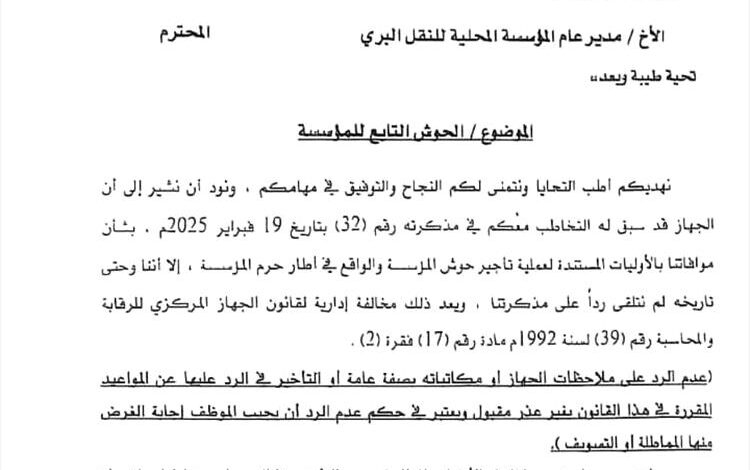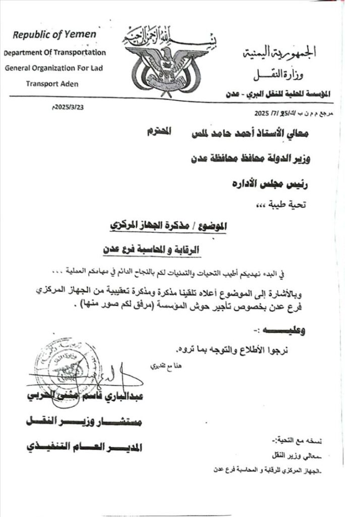 وجّه الجهاز المركزي للرقابة والمحاسبة – فرع عدن، مذكرة رسمية للمرة الثانية إلى مدير عام المؤسسة المحلية للنقل البري عبدالباري الحربي ، طالبًا منه موافاة الجهاز بالوثائق والأوليات المتعلقة بعملية تأجير “الحوش” التابع للمؤسسة، والواقع ضمن نطاق حرمها الرسمي.