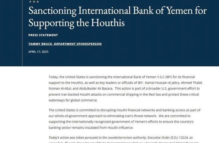 فرض عقوبات على بنك اليمن الدولي لقيامه بدعم الحوثيين