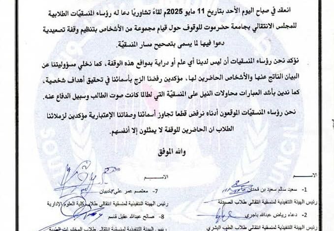 رؤساء منسقيات الانتقالي بجامعة حضرموت يوضحون موقفهم من وقفة “تصحيح المسار” (وثيقة)