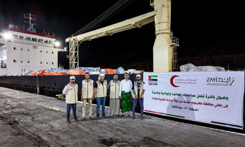 وصول باخرة إماراتية تحمل أطنانًا من الدعم الغذائي والإنساني والخدمي إلى ميناء المكلا بمحافظة حضرموت