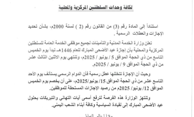 وأوضحت الوزارة في تعميمها رقم (7) لسنة 2025م، أنه نظراً لأن الإجازة تتخللها عطلة رسمية، فإن الدوام الرسمي سيُستأنف يوم الأحد 15 يونيو 2025م، على أن يتم خصم يوم الخميس 12 يونيو من رصيد الإجازات المستحقة للموظفين.