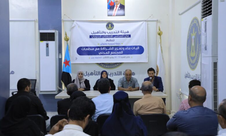 اختتمت هيئة التدريب والتأهيل المساعدة لهيئة رئاسة المجلس الانتقالي الجنوبي، اليوم الخميس، دورة تدريبية بعنوان “آليات بناء وتعزيز الشراكة مع منظمات المجتمع المدني”، والتي استهدفت عددًا من كوادر المجلس الانتقالي الجنوبي من ذوي الاختصاص.