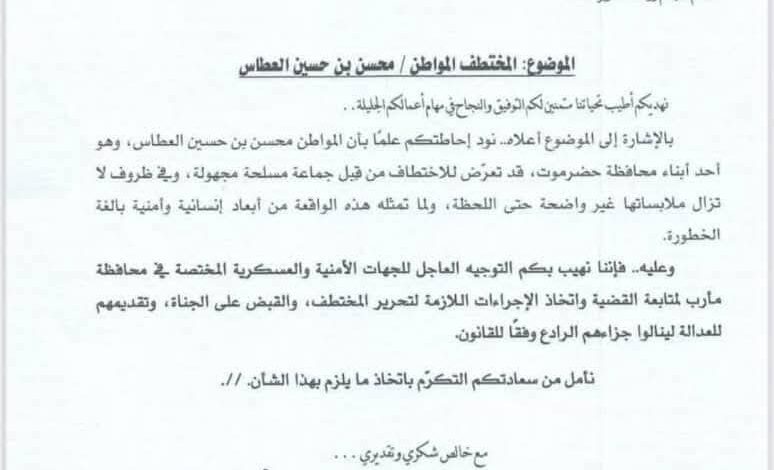 وجّه عضو مجلس القيادة الرئاسي اللواء الركن فرج سالمين البحسني، خطابًا رسميًا إلى زميله في المجلس ومحافظ محافظة مأرب اللواء سلطان العرادة، بشأن حادثة اختطاف المواطن الحضرمي محسن بن حسين العطاس.