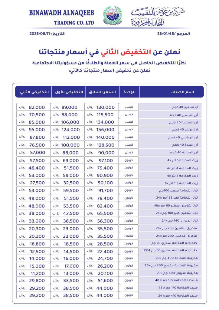 أعلنت شركة بن عوض النقيب للتجارة والمقاولات، الاثنين، عن إطلاق التخفيض الثاني على أسعار منتجاتها، استجابةً لانخفاض سعر العملة المحلية وانطلاقًا من مسؤوليتها الاجتماعية تجاه المستهلكين.