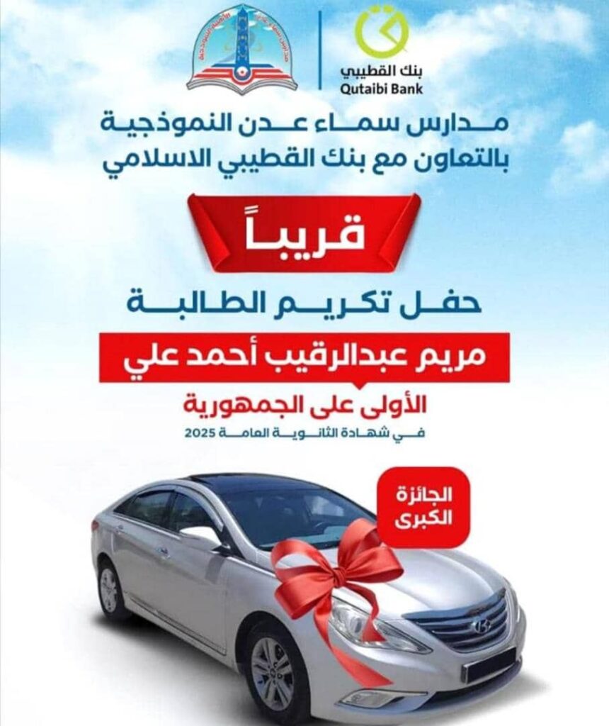 لأول مرة في عدن..مدارس سماء عدن تنفرد بتكريم نوعي للفائزة الأولى في الجمهورية بالثانوية العامة بجائزة كبرى (سيارة)