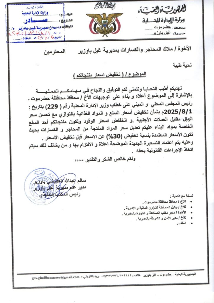 أصدر مدير عام مديرية غيل باوزير، رئيس المكتب التنفيذي، الأستاذ سالم عبدالله العطيشي باوزير، تعميماً رسمياً موجّهاً إلى ملاك المحاجر والكسارات في المديرية، يقضي بتخفيض أسعار المنتجات بنسبة 30%، وذلك تنفيذاً لتوجيهات محافظ محافظة حضرموت رئيس المجلس المحلي، الأستاذ مبخوت مبارك بن ماضي، وبناءً على خطاب وزير الإدارة المحلية رقم (229) بتاريخ 1 أغسطس 2025م.