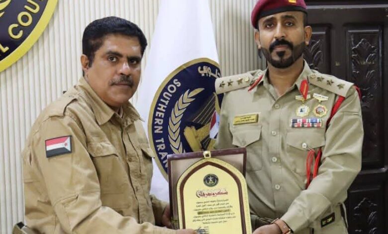 كرم رئيس الهيئة التنفيذية للقيادة المحلية للمجلس الانتقالي الجنوبي بمحافظة حضرموت العميد الركن سعيد أحمد المحمدي، اليوم الخميس، بمكتبه بالمكلا، النقيب المهندس محمد محمود باجابر، مدير الإدارة السياسية بتنفيذية انتقالي حضرموت، بمناسبة تفوقه في معهد تأهيل القادة والأركان – صلاح الدين بالعاصمة عدن.