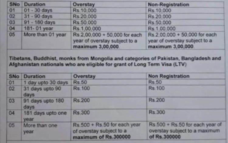 وبحسب التعميم، ستبدأ الغرامات بمبلغ 10,000 روبية على من يتجاوز إقامته من يوم واحد وحتى 30 يومًا، وتتدرج العقوبات بحسب المدة، حتى تصل إلى 300,000 روبية على من تجاوز فترة عام كامل.