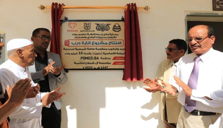 افتتح وكيل محافظة حضرموت المساعد لشؤون مديريات الوادي والصحراء عبدالهادي التميمي، اليوم، ومعه مدير عام مديرية تريم عبدالكريم بابطاط، مشروع “إنارة درب 3” في مديرية تريم، الذي نفذته مؤسسة آل شملان للتنمية، بإشراف مكتب وزارة التربية والتعليم بوادي وصحراء حضرموت، وبتمويل من منظمة POMOZI.BA.