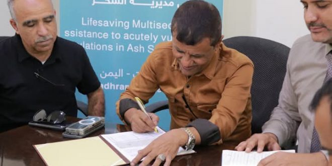 جرى اليوم لمديرية الشحر التوقيع من قبل المهندس زاهر باخوار مدير عام مؤسسة المياه بساحل حضرموت والاستاذ عادل أحمد باعكابة المدير العام لمديرية الشحر على تسليم موقع مشروع تقديم المساعدة متعددة القطاعات للسكان الأشد احتياجا في مديرية الشحر ، بتمويل من صندوق التمويل الإنساني في اليمن (YHF) ، وتنفيذ جمعية الوصول الإنساني للشراكة والتنمية – فرع المكلا للمقاول المنفذ مؤسسة عاطف الهابون للمقاولات .