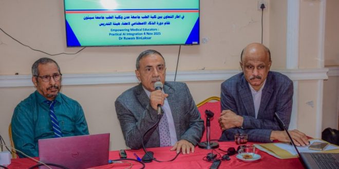 برعاية كريمة من الأستاذ الدكتور/الخضر ناصر لصور رئيس جامعة عدن، نظمت كلية الطب والعلوم الصحية، صباح أمس الثلاثاء 4 نوفمبر، فعالية تدريبية نوعية بعنوان “الذكاء الاصطناعي لأعضاء هيئة التدريس”، وذلك بإشراف الأستاذ الدكتور/ عبدالحكيم عمر التميمي، عميد الكلية، تزامنًا مع الاحتفالات بالذكرى اليوبيلية الخمسين لتأسيس الكلية، وفي إطار التعاون الأكاديمي بين كلية الطب جامعة عدن وكلية الطب بجامعة سيئون.
