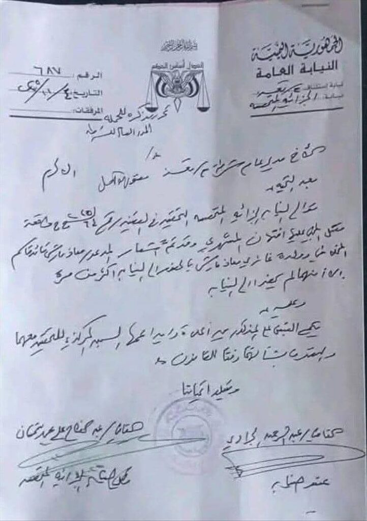 وطبقاً لوثيقة رسمية، فقد وجّهت النيابة، برئاسة القاضي عبدالفتاح علي شمسان وعضوية القاضي عبدالرحمن الجرادي، مذكرة إلى مدير أمن المحافظة تقضي بإلقاء القبض على المذكورين وإيداعهما السجن المركزي، بعد تمردهما على أوامر الاستدعاء المتكررة للتحقيق في القضية.