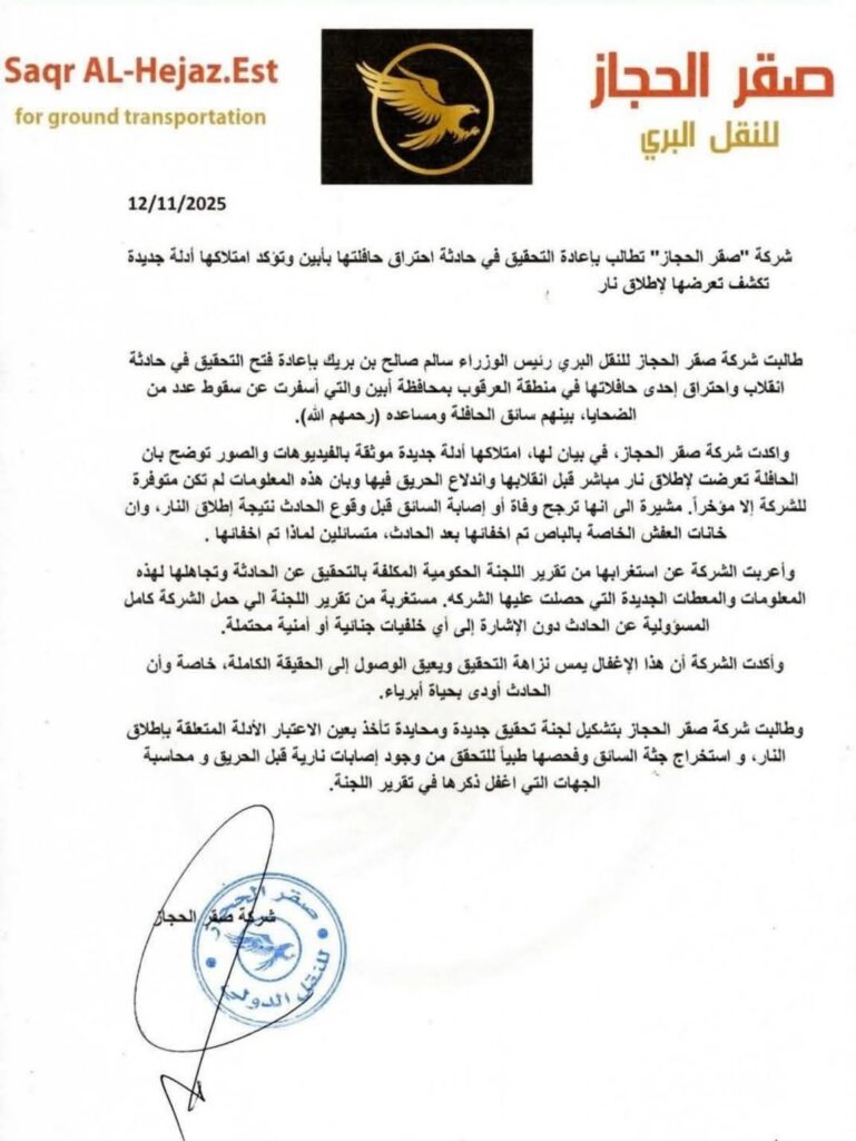 وطالبت شركة صقر الحجاز بتشكيل لجنة تحقيق جديدة ومحايدة تأخذ بعين الاعتبار الأدلة المتعلقة بإطلاق النار، إضافة إلى استخراج جثة السائق وفحصها طبيًا للتحقق من وجود إصابات نارية قبل الحريق، مؤكدة ضرورة محاسبة أي جهات أغفل التقرير السابق الإشارة إليها.