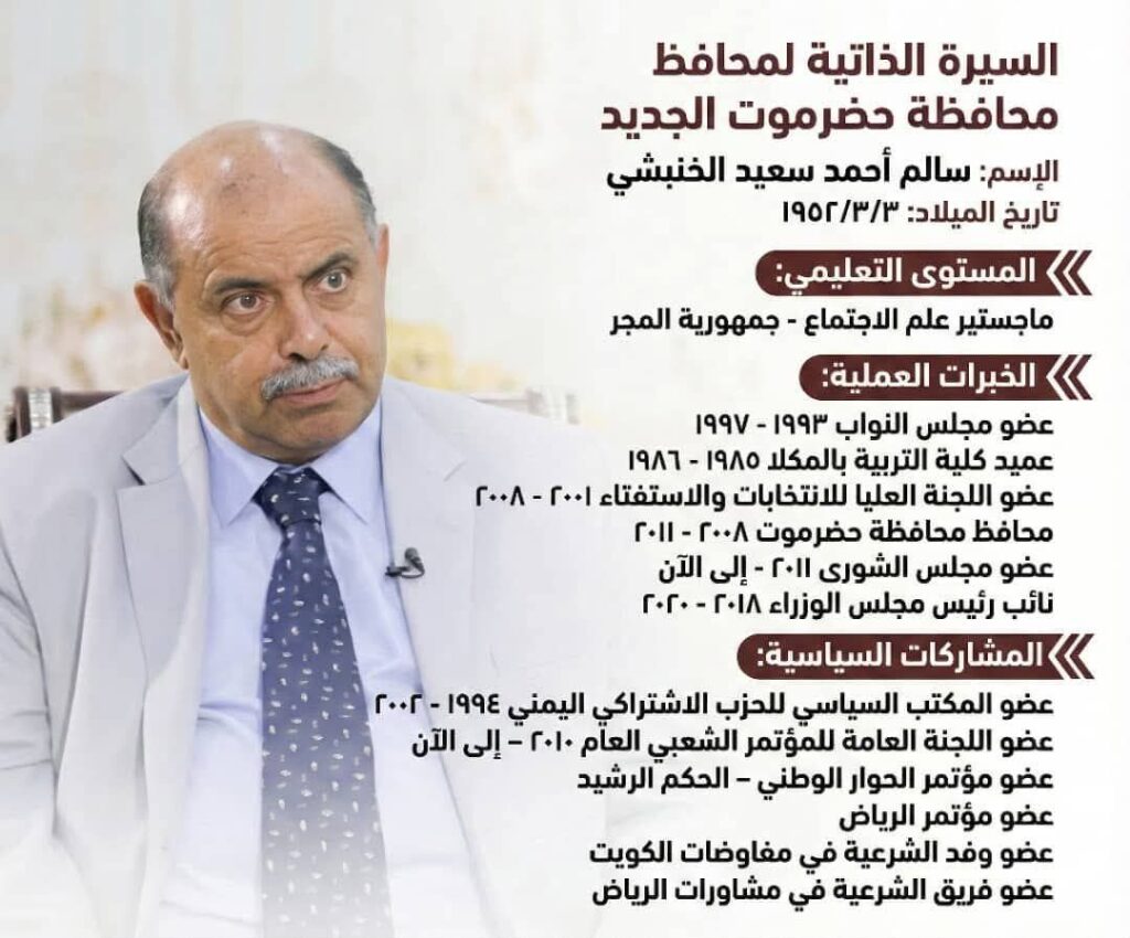 صدر اليوم القرار الجمهوري رقم (٤٥) لسنة 2025 بموجب الدستور، والقانون، ومرجعيات المرحلة الانتقالية، وبعد موافقة مجلس القيادة الرئاسي، قضى بتعيين الأخ / سالم احمد سعيد الخنبشي، محافظا لمحافظة حضرموت.
