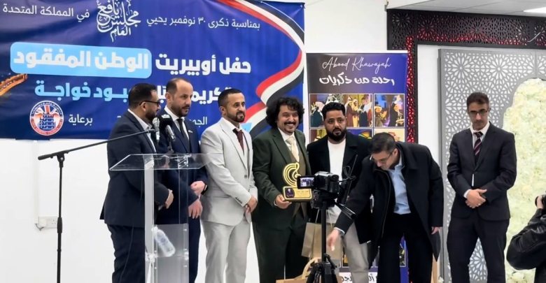 شهدت مدينة شفيلد البريطانية، مساء أمس، احتفالاً بهيجاً بمناسبة الذكرى الثامنة والخمسين لعيد الاستقلال الوطني المجيد في 30 من نوفمبر من العام 1967م. وبدأت الاحتفالية التي نظّمها مجلس يافع العام في المملكة المتحدة، بعرض الأوبيريت الوطني “الوطن المفقود”، الذي قدّمته فرقة كبيرة من الفنانين الجنوبيين بقيادة الفنان الكبير عبود خواجة، إلى جانب عروض موسيقية وغنائية ورقصات شعبية تراثية عبّرت عن قضايا الوطن وذكرياته ومؤكدة على أهمية هذه المناسبة في تعزيز قيم الانتماء والوفاء للوطن، بالإضافة إلى تكريم الفنان الكبير عبود خواجة، تقديرًا لدوره الكبير في إثراء الأغنية الجنوبية والعربية، والحفاظ على التراث الموسيقي الجنوبي الأصيل.