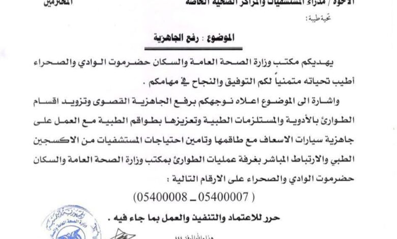 كما شدّد التوجيه على أهمية التحقق من جاهزية سيارات الإسعاف بطواقمها، وضمان وفرة الأكسجين الطبي في كافة المنشآت الصحية، مع الالتزام بالارتباط المباشر بغرفة عمليات الطوارئ في مكتب الصحة بحضرموت الوادي والصحراء عبر الأرقام المخصصة للتواصل الفوري.