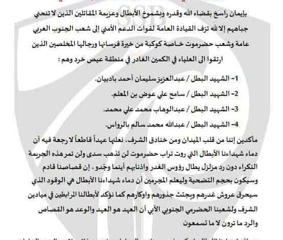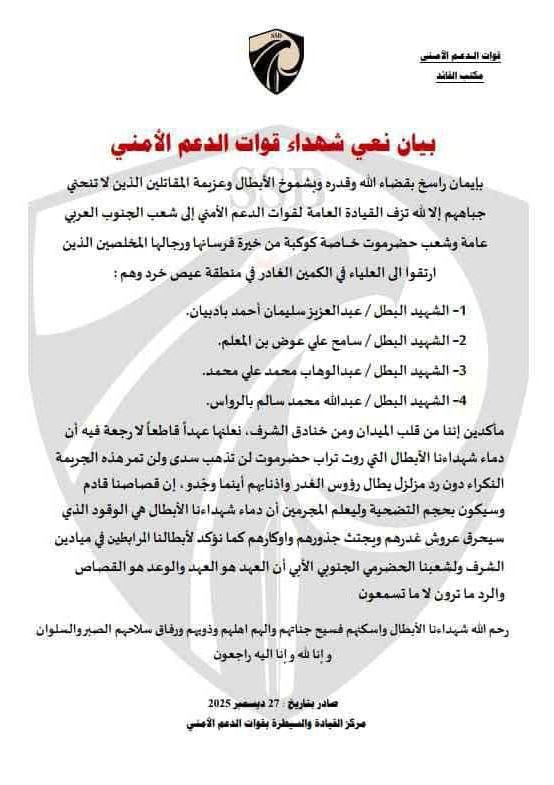 بإيمان راسخ بقضاء الله وقدره وبشموخ الأبطال وعزيمة المقاتلين الذين لا تنحني جباههم إلا لله تزف القيادة العامة لقوات الدعم الأمني إلى شعب الجنوب العربي عامة وشعب حضرموت خاصة كوكبة من خيرة فرسانها ورجالها المخلصين الذين ارتقوا الى العلياء في الكمين الغادر في منطقة عيص خرد وهم :