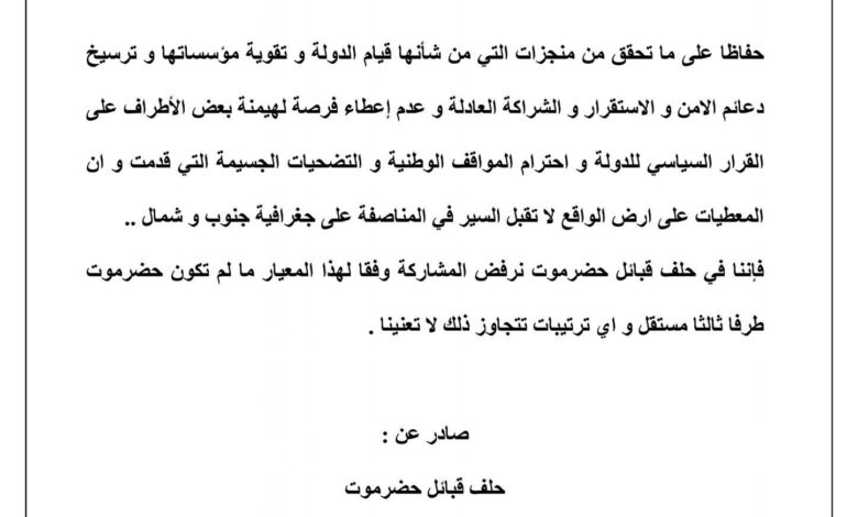 وأشار البيان إلى أن حلف قبائل حضرموت يرفض أي مشاركة أو ترتيبات لا تكون فيها حضرموت طرفًا مستقلًا وفقًا لهذا المعيار، مؤكدًا أن أي ترتيبات تتجاوز ذلك لا تمثل الحلف ولا تلزمه.