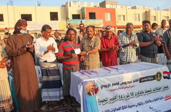 أختتمت إدارة الشباب والطلاب بالقيادة المحلية للمجلس الانتقالي بمديرية المكلا برنامج فعاليات الذكرى الـ58 لثورة 14 أكتوبر المجيدة بمسابقة بطولة السباحة المفتوحة على ضفاف بحر العرب بالميناء القديم بحي الشهيد خالد بالمكلا، بحضور رئيس الهيئة التنفيذية للقيادة المحلية للمجلس الانتقالي بمديرية المكلا المقدم مهدي سعيد المحمدي ونائبه الأستاذ عبدالله فرج بانصيب والأستاذ صالح الباشا مدير الإدارة الإعلامية بالمحافظة وعدد من أعضاء القيادة المحلية بالمحافظة ومديرية المكلا.