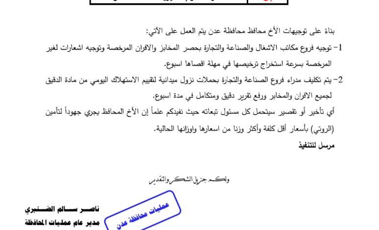 بناء على توجيهات محافظ عدن أحمد حامد لملس، أصدرت عمليات المحافظة تعميم إلى مدراء العموم، وذلك بشأن أفران ومخابز الروتي.