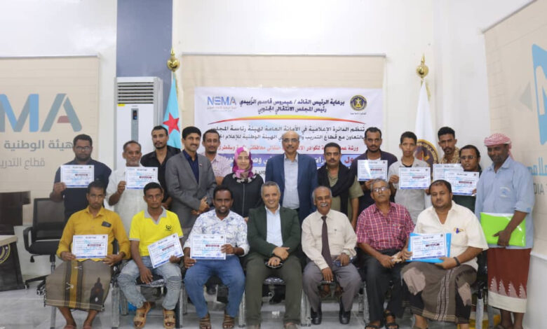 الدائرة الإعلامية وقطاع التدريب والتأهيل يختتمان ورشة العمل التدريبية لمنتسبي الإدارات الإعلامية في المهرة وسقطرى