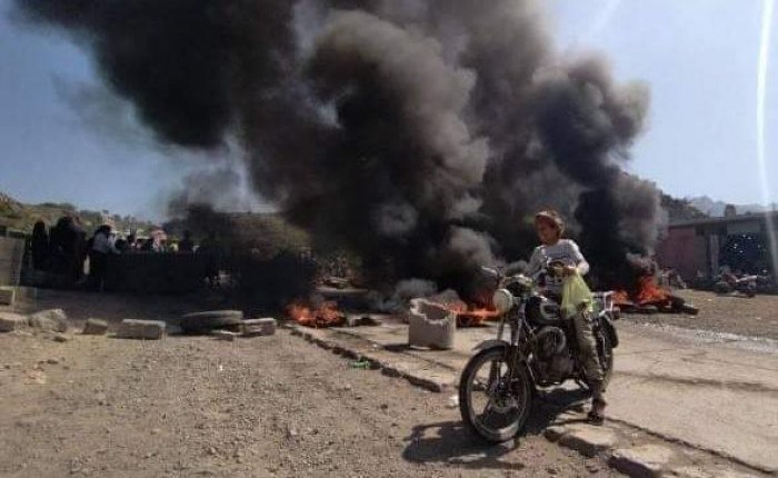 وقطع المحتجون طريق الضباب الواصل إلى مدينة تعز، وأشعلوا إطارات السيارات، تنديدًا بجرائم عناصر مليشيات الشرعية الإخوانية.