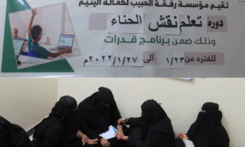أقامت مؤسسة رفقة الحبيب لكفالة اليتيم دوره بعنوان تعلم نقش الحناء يوم الاحد ٢٣ يناير في مقر المؤسسة بالشرج ، حيث بلغت مدة الدورة ٧ ايام . واستهدفت الدوره أمهات أيتام المؤسسة، تحت اشراف المدربه الأستاذة جيهان بن سليم.