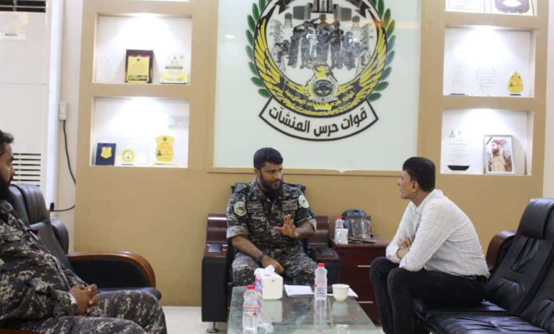 التقى العميد أحمد مهدي بن عفيف قائد قوات حرس المنشآت الحكومية اليوم في مكتبه مدير عام مكتب الشباب والرياضة في العاصمة عدن الكابتن وجدان شاذلي.