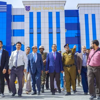 دشن محافظ شبوة عوض بن الوزير العولقي ورئيس جامعة شبوة الدكتور توفيق باسردة أول امتحانات فصلية بالجامعة في العام الدراسي الأول للجامعة