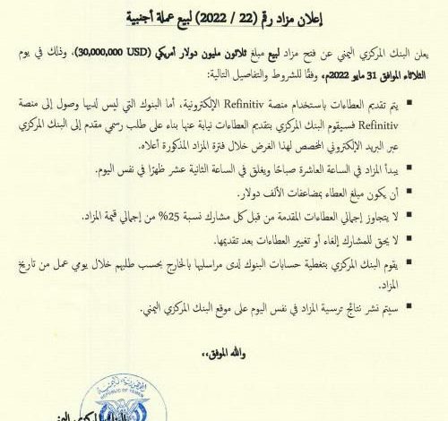 يعلن البنك المركزي اليمني عن فتح مزاد لبيع مبلغ ثلاثون مليون دولار أمريكي (30,000,000 USD)، وذلك في يوم الثلاثاء الموافق 31 مايو 2022م، وفقًا للشروط والتفاصيل التالية: